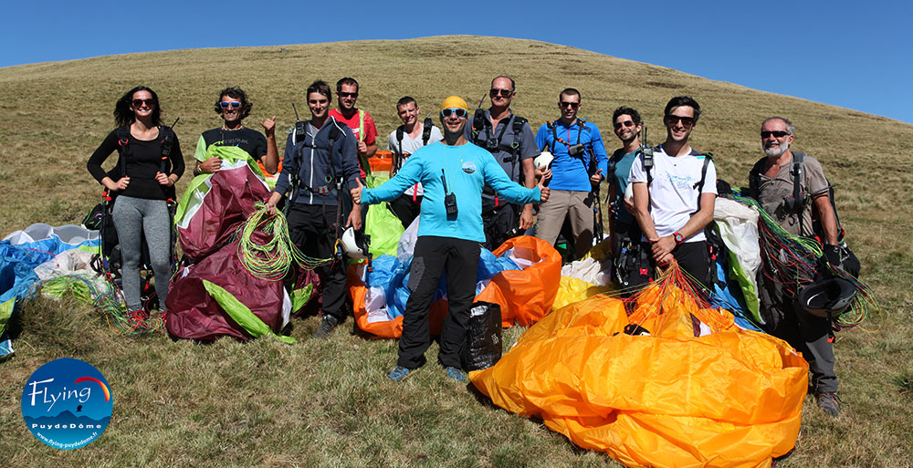 Flying Puy de Dôme c'est avant tout des élèves, élèves de nos stages initiation, perfectionnement, performance, voyage mais aussi des élèves venant juste faire un baptême découverte, perf ou handicare en parapente. Nous aimons bien cette idée que les passagers de nos vols en double ne sont pas des personnes transportées mais de véritables élèves venant découvrir grâce au vol en tandem les joies du parapente dans le ciel d'Auvergne, le temps d'une balade au dessus des volcans.